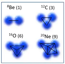 La figure présente les assemblages géométriques des états fondamentaux pour les premiers noyaux de la série[5], ainsi que le nombre de liaisons actives entre les clusters ; l'énergie de liaison des noyaux dépend linéairement du nombre de liaisons[5]. À partir de quatre clusters, plusieurs géométries sont possibles, elles correspondent à différents niveaux d'énergie possibles pour les noyaux.