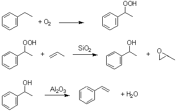 Le second procédé, moins utilisé, s'effectue en plusieurs étapes. L'éthylbenzène est d'abord oxydé à 150 °C sous une pression de 2 bar. Le produit formé (un peroxyde) réagit ensuite avec du propène à 115 °C sous pression élevée et en présence de dioxyde de silicium pour former de l'α-phényléthanol. Ce dernier subit ensuite une déshydratation à 200 °C environ, en présence d'alumine pour former le styrène.