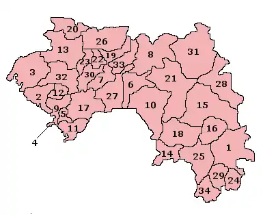 1.Beyla 2.Boffa 3.Boké 4.Conakry 5.Coyah 6.Dabola 7.Dalaba 8.Dinguiraye 9.Dubréka 10.Faranah 11.Forécariah 12.Fria 13.Gaoual 14.Guéckédou 15.Kankan 16.Kérouané 17.Kindia 18.Kissidougou 19.Koubia 20.Koundara 21.Kouroussa 22.Labé 23.Lélouma 24.Lola 25.Macenta 26.Mali 27.Mamou 28.Mandiana 29.Nzérékoré 30.Pita 31.Siguiri 32.Télimélé 33.Tougué 34.Yomou.