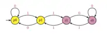 - La suite de Rudin–Shapiro est engendrée par un automate fini à quatre états. Dans l'automate, les états coloriés en jaune produisent un terme +1, et les états coloriés en rouge un terme -1. Les noms des états mémorisent la situation : p pour un nombre pair d'occurrences de 11, et i pour un nombre impair; cette lettre est suivie du dernier bit lu. Par exemple, pour l'entier 108, dont l'écriture binaire est 11011000, la suite des états parcourus est