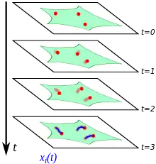 En biologie, le suivi de particules uniques est largement utilisé pour quantifier la dynamique des molécules/protéines dans les cellules vivantes (des bactéries, des levures, des cellules de mammifères et des embryons vivants de drosophile )[4],[5],[6],[7]. Il a été largement utilisé pour étudier la dynamique des facteurs de transcription dans les cellules vivantes[8],[9],[10]. Cette méthode a été largement utilisée au cours de la dernière décennie pour comprendre le mécanisme de recherche ciblées des protéines dans les cellules vivantes. Il aborde des questions biologiques fondamentales telles que comment une protéine d’intérêt trouve sa cible dans l’environnement cellulaire complexe ? combien de temps lui faut-il pour trouver son site cible de liaison ? quel est le temps de séjour des protéines qui se lient à l'ADN ? [5] Récemment, la SPT a été utilisée pour étudier la cinétique de la traduction et du traitement des protéines in vivo. Pour les molécules qui se lient à de grandes structures telles que les ribosomes, la SPT peut être utilisée pour extraire des informations sur la cinétique de liaison. Comme la fixation du ribosome augmente la taille effective de petites molécules, leur taux de diffusion diminue lors de la fixation. En modifiant les comportements de diffusions de ces protéines, des mesures directes des événements de liaison sont obtenues[11],[12]. De plus, des particules exogènes sont utilisées comme sondes pour évaluer les propriétés mécaniques du milieu, une technique connue sous le nom de microrhéologie passive[13]. Cette technique a été appliquée pour étudier le mouvement des lipides et des protéines dans les membranes[14], les molécules du noyau [7] et du cytoplasme[15], les organites et leurs molécules[16], les granules lipidiques[17],[18],[19], vésicules et particules introduites dans le cytoplasme ou le noyau. De plus, le SPT a été largement utilisé dans l'étude des bicouches lipidiques reconstituées[20], de la diffusion intermittente entre les phases 3D et 2D (par exemple, une membrane) [21] ou 1D (par exemple, un polymère d'ADN), et réseaux synthétiques d'actine en réseau[22],[23].