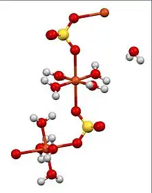 En solution aqueuse, le sulfate de chrome(II) forme des complexes métalliques aqueux, généralement avec six ligands d'eau. Les structures des sels cristallins sont similaires aux hydrates correspondants du sulfate de cuivre(II) : on connaît les dérivés pentahydrate, trihydrate, monohydrate et anhydre du sulfate de chrome. Dans tous ces composés, le centre du Cr(II) adopte une géométrie de coordination octaédrique, étant coordonné à six centres d'oxygène fournis par une combinaison d'eau et de ligands de sulfate[4],[5].