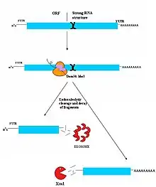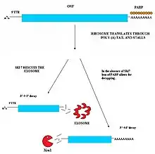 Le Nonstop Mediated decay (NSD) entre en jeu dans la détection et la dégradation des ARNm qui ne possèdent pas de codon stop[19],[20]. Ces ARNm peuvent résulter d'une adénylation en 3' prématurée ou d'un signal de polyadénylation cryptique présent dans la région codante d'un gène[21]. Cette absence de codon stop est délétère pour la cellule : quand le ribosome parvient à la queue 3' Poly-A de l'ARNm, il s'immobilise et ne peut pas éjecter l'ARNm[22]. Il n'est donc plus possible pour ces ribosomes de participer à la synthèse des protéines. Le nonstop mediated decay intervient afin de détacher les ribosomes immobilisés de marquer les ARNm défectueux pour qu'ils soient dégradés par des nucléases. Deux voies de nonstop mediated decay ont été identifiées et agissent probablement conjointement[19],[20].