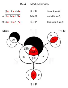 • Un mode donné peut être réduit au mode parfait portant la même initiale (B, C, D, F). Ainsi, Bocardo peut être réduit à Barbara, Cesare peut être réduit à Celarent, Dimatis peut être réduit à Darii, et Ferison peut être réduit à Ferio, etc.