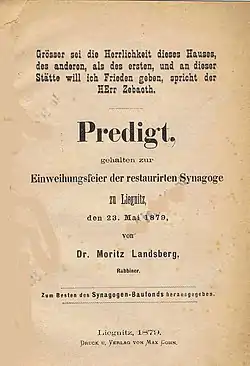 « Hier soir, s'est déroulée une inauguration solennelle dans la synagogue, dont la reconstruction a permis d'obtenir une plus grande surface. Grâce à de nouveaux équipements et à de nouveaux éléments décoratifs, la synagogue a été adaptée aux besoins et aux souhaits de la communauté israélite locale. Le bâtiment, dont l'intérieur fait forte impression, était plein et parmi la foule qui s'est présentée ce jour-là, se trouvaient des membres de la communauté de la synagogue de Liegnitz, ainsi que de nombreux autres fidèles venus des villes voisines. Des invités des autres religions, ainsi que des représentants du gouvernement royal local et du conseil municipal ont assisté à la cérémonie et ont suivi avec intérêt cette inauguration très digne. La cérémonie a débuté par de magnifiques antiennes liturgiques, au cours desquelles le chantre et une chorale très bien préparée ont entonné Honore ton Seigneur. Après les rouleaux de la Torah richement décorés ont été apportés par le rabbin et le responsable de la communauté et placés dans le placard de l'autel restauré recouvert d'un nouveau rideau, cadeau des femmes de la communauté.... Après les chants inauguraux, le sermon solennel prononcé par Mr le rabbin Dr. Landsberg, et préparé spécialement pour cette cérémonie, a été le point central de toute cette cérémonie. »