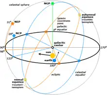où ε = 23.439281° représente l'obliquité de l'écliptique, c'est-à-dire l'angle que forme le plan de l'équateur terrestre avec le plan de l'orbite terrestre autour du soleil.