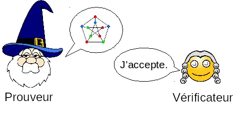 - le prouveur est une machine déterministe sans limite de ressources qui construit, à partir de l'instance (par exemple un graphe à colorier) un certificat (une coloration des sommets) ;