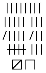 Les marques sont couramment rassemblées en groupes de cinq pour améliorer la lisibilité. Cela est similaire à la pratique d'utiliser un séparateur de milliers (comme une espace, un point ou une virgule) dans l’écriture occidentale usuelle du système décimal, ce qui permet de rendre les nombres tels que 1 234 567 plus faciles à lire. Ces groupes de cinq peuvent être symbolisés par espacement des groupes successifs, éventuellement en ajustant obliquement la première ou dernière marque de chaque groupe, ou encore en barrant le groupe avec la dernière marque.