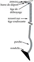 La perche et son assise possèdent en partie haute un anneau composé d'une douille entourant le câble et d'une main en acier déportant la tension qui le relie au fil de traction permettant le débrayage du téléski et l'évitement des poteaux guidant le câble tout le long de la remontée.