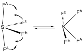 Ces deux types de liaisons ne sont pas visibles dans le spectre obtenu par résonance magnétique nucléaire au fluor-19 de la molécule SF4, qui ne montre qu'un seul signal : ceci proviendrait des pseudorotations de Berry, au cours desquelles les atomes axiaux et équatoriaux échangent leur position à une fréquence supérieure à la résolution temporelle de la RMN, qui est de l'ordre de la milliseconde[7].