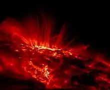 - une éruption solaire est la libération soudaine d'énergie à la surface du Soleil. Bien qu'elle ne se traduise pas par des changements visibles dans la luminosité du Soleil, elle peut avoir un effet sur l'activité à la surface de la Terre : l'énergie libérée peut en effet fortement perturber les systèmes de communications sur Terre. Les spécialistes du Soleil pensent que ces éruptions sont également liées au champ magnétique du Soleil et TRACE doit rechercher des indices montrant la relation entre les éruptions solaires et le champ magnétique du Soleil.