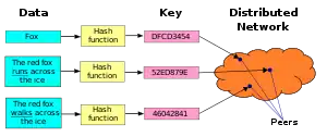 Une table de hachage est une structure de données de type clé → valeur. Chaque donnée est associée à une clé et est distribuée sur le réseau. Les tables de hachage permettent de répartir le stockage de données sur l’ensemble des nœuds du réseau, chaque nœud étant responsable d’une partie des données. Les tables de hachage distribuées fournissent un algorithme pour retrouver le nœud responsable de la donnée et sa valeur à partir de la clé.