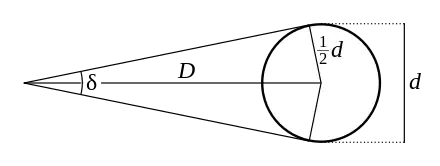 Un objet ayant une dimension d dans une orientation perpendiculaire à la direction de l'observation, vu centré à une distance D, intercepte un angle δ. La moitié de la dimension de l'objet et les droites qui joignent la position de l'observateur au milieu de l'objet et à une de ses extrémités forment un triangle rectangle, dont l'angle au point d'observation est la moitié de δ, et pour lequel, par définition,