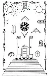 La composition visuelle décrite dans le Régulateur du maçon[4] présente pour le 1er grade (apprenti) par exemple : une perspective orientée partant d'un seuil délimité par les deux colonnes, « J » au nord et « B » au sud[N 2], précédées de marches et passant par un « pavé mosaïque » amenant le regard vers le fronton du Temple. Dans cet espace ainsi délimité sont disposés, avec une rigoureuse logique spatiale, des pierres, des outils, un niveau et une perpendiculaire au nord et au sud, une équerre et un compas à l'est et à l'ouest, trois fenêtres, une planche à tracer, le tout inclus dans une composition avec le soleil et la lune, qui est parfois représentée au milieu d'étoiles[5]. Cette composition rectangulaire est parfois bordée d'une « houppe dentelée »[N 3],[6].
