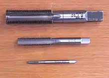Pour le taraudage manuel, on utilise un tourne-à-gauche (ou une morille). Généralement, le taraudage à la main s'effectue en trois passes successives à l'aide d'un jeu de trois tarauds spécialisés appelés :