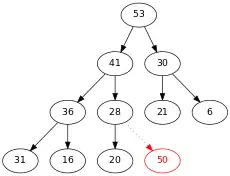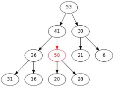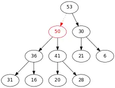 On compare 50 et son père 53. Comme 50 < 53, on n'échange pas les positions de 50 et 53, et on a fini de modifier notre arbre. Il respecte à présent toutes les contraintes d'un arbre binaire.