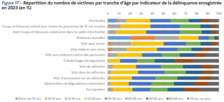 « Des mis en cause plus jeunes que la moyenne, et plus souvent de nationalités étrangères. Le nombre de mis en cause pour des infractions élucidées en 2023 par les services de police et de gendarmerie rapporté à la population française décroît avec l’âge : 4,6 auteurs présumés pour 100 habitants entre 15 et 19 ans et 5,0 entre 20 et 24 ans ; 1,8 pour 100 habitants entre 40 et 44 ans ; 0,3 pour 100 habitants entre 60 et 64 ans (figure 18). Les étrangers représentent 17 % du total des mis en cause en 2023 contre 8 % des personnes résidant en France.