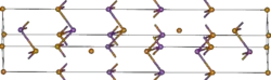 ![]() Structure cristalline du tellurure de bismuth (les atomes de bismuth sont en violet) |