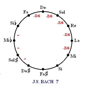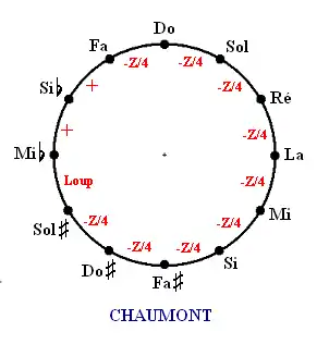 - Les tierces Si-Ré, Fa-La, Do-Mi, Sol-Si, Ré-Fa et La-Do sont bonnes, corrigées de 2/3 de comma et les deux quintes augmentées d'un tiers de comma sont placées de telle façon qu'aucun véritable loup ne se manifeste.