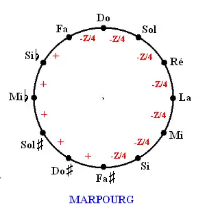 - Le comma pythagoricien est réparti par quarts sur 4 quintes (qui deviennent ainsi un peu courtes) : Do-Sol, Sol-Ré, Ré-La et Si-Sol.