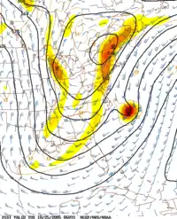 On remarque sur la seconde image que la température de surface de la mer est particulièrement chaude (couleurs jaunes) entre la Floride et le Cap Hatteras (la pointe la plus avancée de la côte). Lorsque l'air froid rencontre cette zone d'air doux au-dessus du Golfe du Mexique et du Gulf Stream, il crée une zone barocline intense appelé un front[1],[2].