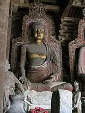 Il contient sept grandes sculptures représentant des Bouddhas. Outre Sakyamuni, ce sont les six bouddhas antiques qui l'ont immédiatement précédé : Vipashyin, Sikhin, Visvabhu, Krakucchanda, Kanakamuni et Kashyapa, chacun flanqué de deux bodhisattvas avec la tête d'un roi gardien faisant face au sud tandis qu'une statue de Guanyin, le boddisattva de la compassion est tournée vers la porte de derrière[2].