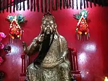 La statue dorée de Guan di, au port majestueux et à la barbe respectable se situe au fond du temple. La légende dit que la statue ne doit être nettoyée qu'une fois par an, le jour de son anniversaire. À ses pieds, brûle continuellement une lampe à l'huile.