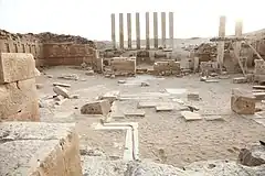 Au nord-est, une construction semi-rectangulaire, dont chaque côté est relié au mur d'enceinte, marque l'entrée principale du sanctuaire. Pour entrer dans la partie sacrée, les visiteurs devaient traverser une première pièce annexe avant d'accéder à une salle plus grande, encadrée par un péristyle de trente-deux colonnes et une série de bancs en pierre volcanique. Les murs du bâtiment, construits avec des blocs de calcaire taillés et disposés de la même façon que pour le mur d'enceinte, sont décorés par des dizaines de fausses fenêtres réparties sur deux niveaux. Une collection de statuettes en bronze et en marbre, pour la plupart incomplètes, ont été trouvées lors des fouilles de l'AFSM en 1951-1952. Malgré le pillage du site sur une très longue période, les nombreuses inscriptions encore lisibles sont étudiées par les épigraphistes modernes, permettant de dater les différentes phases de construction du bâtiment et du temple[1],[6].