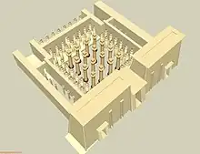 En l'état actuel de notre connaissance de l'édifice la porte axiale donnait accès à une salle hypostyle dont l'aménagement présente également une grande originalité.