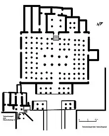 Les restes des fondations du mur et des colonnes à l'ouest derrière l'hypostyle suggèrent que le temple était divisé en trois parties principales, chacune avec sa propre voie processionnelle à travers la salle. La partie centrale était sans doute dédiée à Amon et contenait la salle à quatre piliers de la barque sacrée d'Amon, dans laquelle elle était conservée lors de sa visite au temple, derrière elle la salle de la table sacrificielle et enfin, dans l'axe longitudinal, le sanctuaire[11].