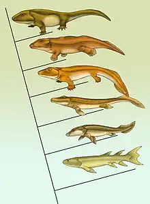 Fossiles de transition de bas en haut : Eusthenopteron, Panderichthys, Tiktaalik, Acanthostega, Ichthyostega, Pederpes.