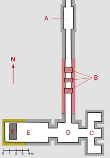 A = Couloir ; B = Herses ; C = Chambre à niches ; D = Antichambre ; E = Chambre funéraire ; F = Sarcophage