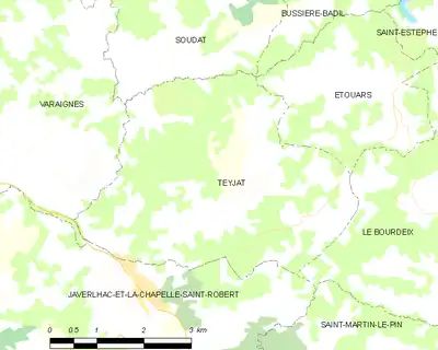 Teyjat est limitrophe de six autres communes dont Bussière-Badil au nord-est par un quadripoint.