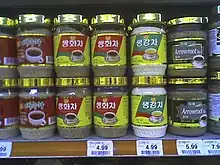 홍삼차 (hongsam cha), chinois 紅蔘茶 (hóng shēn chá). Ce ginseng a longtemps été un monopole coréen[126]. La littérature académique sur cette tisane se concentre sur les applications médicinales (cancer, anémies, anticoagulant[127], photo vieillissement cutané des souris chauves[128], etc.). Les modes de traitement de la racine engendrent des gouts différents des décoctions. Les préférences des consommateurs coréens sont diverses, les uns aiment les thés rouges de ginseng rouge produits avec haute pression hydrostatique et fermentation, les autres la forte saveur de ginseng de la méthode traditionnelle, enfin le goût sucré et à la saveur de jujube des extraits alcooliques trouve l'approbation d'un troisième groupe[129].