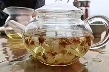 Camomille de Chine, Chrysanthemum indicum, 국화차 (gughwa cha), chinois 菊花茶 (júhuā chá). Il s'agit d'une fleur usuellement utilisée en médecine traditionnelle chinoise, son potentiel antioxydant a donné lieu en Corée à diverses études sur sa durée de torréfaction[68] ainsi que sa qualité organoleptique (qui est optimale ave 5 passages à la poêle)[69]. Le composant aromatique volatil prédominant est la chrysanthénone (10,01 %[70]. Une libération plus rapide des antioxydant actifs est obtenue avec une infusion à 50 °C[71].