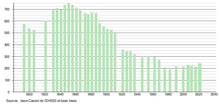 L'évolution du nombre d'habitants est connue à travers les recensements de la population effectués dans la commune depuis 1793. Pour les communes de moins de 10 000 habitants, une enquête de recensement portant sur toute la population est réalisée tous les cinq ans, les populations légales des années intermédiaires étant quant à elles estimées par interpolation ou extrapolation[35]. Pour la commune, le premier recensement exhaustif entrant dans le cadre du nouveau dispositif a été réalisé en 2005[36].