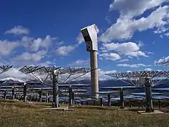 - un champ d’héliostats, structures mobiles équipées de miroirs, qui suivent automatiquement la course du soleil pour réfléchir et concentrer en permanence le rayonnement solaire sur une cible en haut d’une tour. Sur les 201 prévus initialement, 195 héliostats sont aujourd'hui pleinement utilisables (les 6 autres ayant été démantelés pour les besoins des expériences d’astrophysique) ;