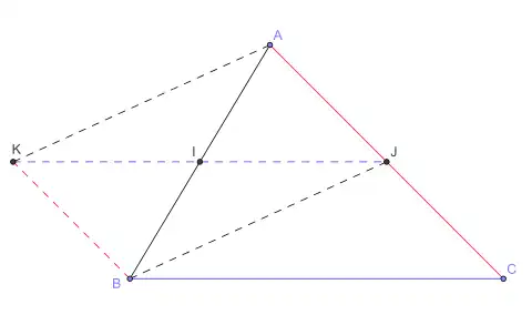 Cette propriété se démontre[2] sans que soit connue la définition d'un vecteur. Sur la figure, (IJ) est la droite des milieux dans ABC qu’on veut prouver parallèle à (BC).