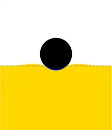 Soit une sphère déformable de rayon en contact avec un demi espace rigide. Sous l'effet conjugué de la force extérieure et de l'énergie de Dupré qui favorise le contact, la bille subit un enfoncement . L'aire de contact avec la surface plane est un disque de rayon (on suppose ).