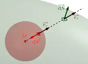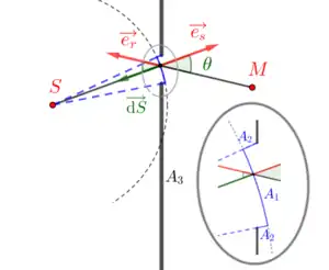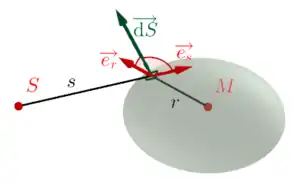 - la calotte sphérique du faisceau qui pénètre par l'ouverture ; le champ scalaire y est identique en tout point, et y sont de même direction et de sens opposé ;