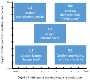 Comme pour la grille de Blake et Mouton, on peut distinguer cinq grandes attitudes : 1,1 ; 1,9 ; 9,1 ; 5,5 ; et 9,9.