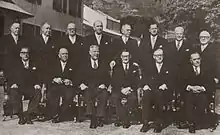 Assis de gauche à droite: Theophilus Dönges, Paul Sauer, Hendrik Verwoerd, Ernest George Jansen (gouverneur-général), Charles Swart, Eric Louw. Debout de gauche à droite: Jan Serfontein, M.D.C. De Wet Nel, A.J.R. van Rhijn, Jan de Klerk, Ben Schoeman, P.M.K Le Roux, François Christiaan Erasmus et Jozua François Naudé.