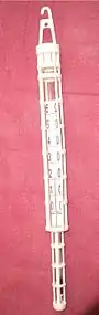 - thermomètre mouillé : dont le réservoir est recouvert d'une mèche de mousseline humide ou d'une pellicule de glace pure, le tout étant ventilé, pour mesurer la température du point de rosée[29] (température du thermomètre mouillé) ;