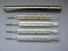 Le thermomètre à mercure a été inventé par Gabriel Fahrenheit en 1724[1]. Son fonctionnement repose sur du mercure contenu dans un tube de verre. Le volume du mercure, donc la longueur de la colonne dans le tube, est fonction de sa température. On peut lire cette dernière grâce à des graduations inscrites le long du tube. Pour augmenter la sensibilité du thermomètre, une ampoule plus large que le tube est formée à l'une de ses extrémités et remplie de mercure ; les petites variations de volume du mercure se traduisent alors par de grands déplacements de l'extrémité de la colonne. L'autre extrémité du tube est remplie d'azote, à une pression plus faible que la pression atmosphérique.