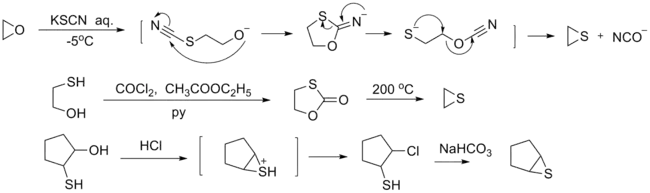 Le thiirane est préparé par réaction entre le carbonate d'éthylène et du thiocyanate de potassium (KSCN) anhydre[10]. À cette fin, le KSCN est tout d'abord fondu sous vide pour éliminer toute trace d'eau :
