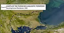 Si l'on exclut le dace (au motif qu'il s'agissait, soit d'une langue thrace distincte, soit, comme le conjecturent certains linguistes, d'une branche distincte de l'indo-européen)[2], le thrace était parlé dans ce qui est aujourd'hui la moitié sud de la Bulgarie[3],[4], la partie orientale de la Macédoine du Nord actuelle, le nord de la Grèce, la partie européenne de la Turquie et dans certaines régions de la Bithynie (nord-ouest de la Turquie d'Asie).