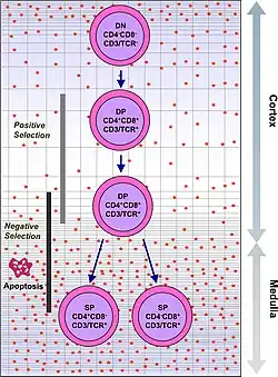 Pour que les thymocytes en développement puissent passer par chacune de ces étapes dans l'ordre et au bon endroit, ils doivent communiquer entre eux, de façon proximale ou distale. Cependant, le développement des thymocytes passe par une sélection rigoureuse du répertoire thymique dans laquelle seuls 1 à 3 % des thymocytes réussissent à survivre et à être exportés du thymus[11],[12],[13].
