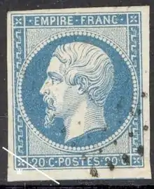 Le 1er juillet, est émis un timbre non dentelé de 20 centimes de couleur bleu représentant l'empereur Napoléon III et légendé « EMPIRE FRANC ». Il remplace le 25 centimes bleu émis en septembre 1852 pour l'affranchissement de la lettre jusqu'à 7,5 grammes.