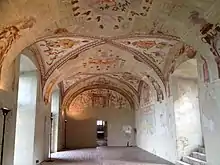 La seconde salle est couverte par une voûte en croix ornée de fresques représentant un velum peint en cercles concentriques au centre de la voûte. Quatre cartouches se détachent au milieu, séparés par de fines branches entrelacées où volent de petits oiseaux flanqués de figures mythologiques[33].