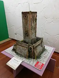 La tour centrale a un plan carré de 5,20 m de côté et possède une entrée orientée à l'est surélevée d'environ 6 m au-dessus du niveau de la cour.